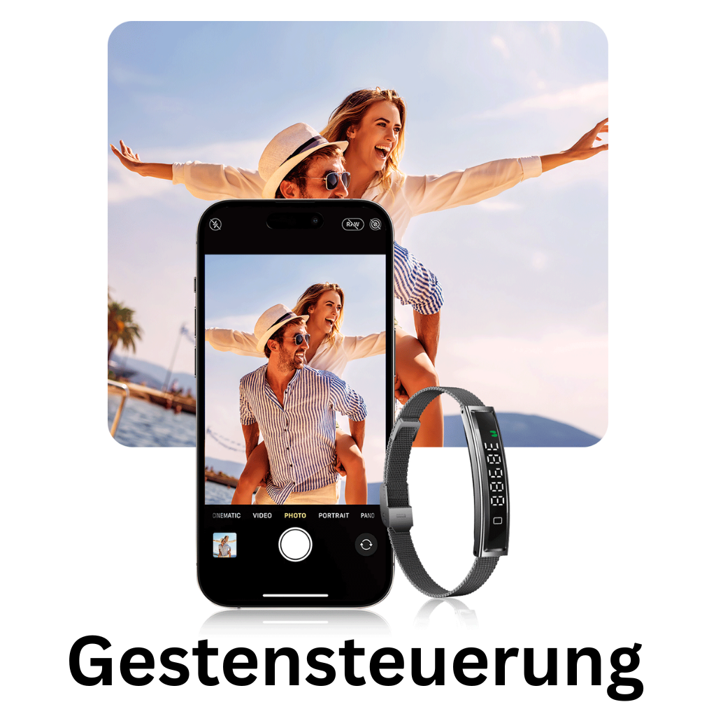 Die Gestensteuerung mit dem Smart Armband ermöglicht es, Fotos mit einem Smartphone oder einer Kamera aufzunehmen, ohne dass direkte Berührung notwendig ist. Durch einfache Handgesten, die das Armband über Sensoren erkennt und drahtlos an das verbundene Gerät übermittelt, werden Befehle wie das Fotoauslösen umgesetzt. Diese Technologie bietet verbesserte Zugänglichkeit und ermöglicht kreativere Fotoaufnahmen, da der Benutzer physisch nicht am Gerät sein muss, um ein Foto zu machen.